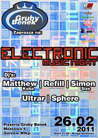26.02 ELECTRONIC MUSIC NIGHT GRUBY BENEK GORZÓW WLKP UL.MOSTOWA 4 (OBOK MATNARY) ZAGRAJĄ DJ`S - MATTHEWKOBA (GORZÓW) WWW.MATTHEWKOBA.PL - REFILL (GORZÓW) WWW.PCREW.PL - SIMON SIZE (GORZÓW) WWW.PCREW.PL - ULTRAR (KOSTRZYN) - SPHERE (MYŚLIBÓRZ) TIME TABLE 22-23 SPHERE 23-00 ULTRAR 00-01 MATTHEWKOBA 01-02 SIMON SIZE 02-03 REFILL WJAZD FREE MUZYKA: - ALTERNATYWNA - TANECZNA - ELEKTRONICZNA - HOUSE - TECH HOUSE - DEEP - DRUM N BASS