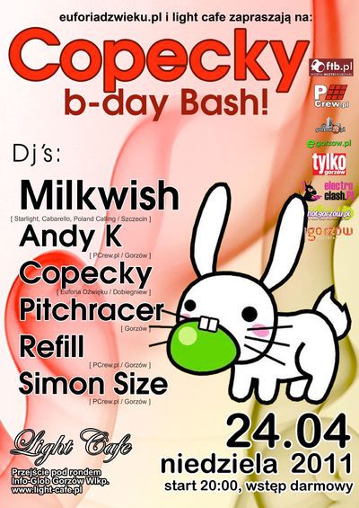 W dniu kiedy wszyscy spragnieni dobrej zabawy odrywają się od stołów wielkanocnych by wyruszyć do klubów w poszukiwaniu dobrej zabawy, wyjątkowo w niedziele, zaprasza WSZYSTKICH na urodziny Dj Copala. Impreza odbędzie się w niezwykle klimatycznym i gustownym miejscu jakim niewątpliwie jest Light Cafe, lokal znajdujący się pod rondem Info glob potocznie zwanym pająkiem.