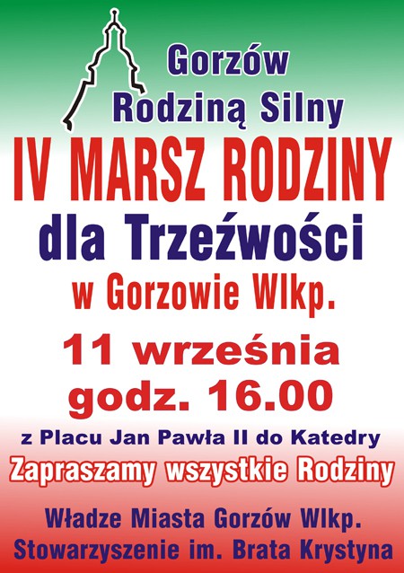 11 września 2010 roku ulicami Gorzowa wyruszy Marsz Rodziny dla Trzeźwości, na który już dziś zapraszamy wszystkich mieszkańców Gorzowa i województwa, całe rodziny, a szczególnie dzieci i młodzież.15 października 2010 roku odbędzie się drugi Kongres Rodziny nt. problemów dzieci i młodziezy. Mamy nadzieję, że wzorem roku ubiegłego oba przedsięwzięcia zgromadzą setki uczestników zainteresowanych i zatroskanych o wychowanie i przyszłość młodego pokolenia.