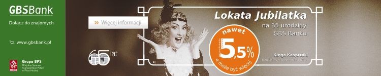 Lokata Jubilatka to limitowana wersja lokaty, którą GBS Bank wprowadził do oferty z okazji swoich 65 urodzin. To szansa wygrania w Programie Jubileuszowym jednej z 65 atrakcyjnych nagród, w tym nagrody głównej - 65 tysięcy złotych.