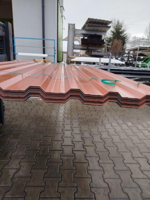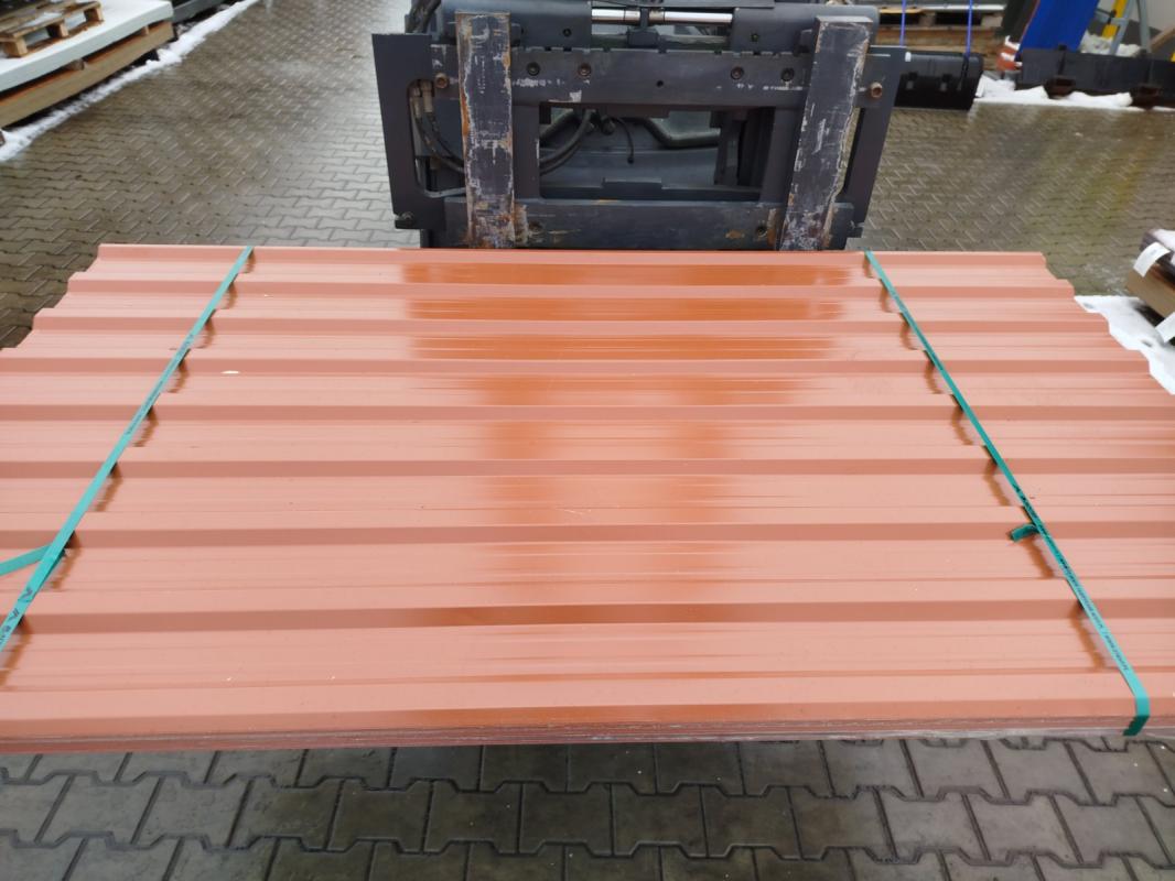 Blacha trapezowa T-18 ceglany połysk. Blacha może posiadać wady na powłoce oraz różnice w odcieniach. SPRZEDAŻ WYŁĄCZNIE NA CAŁE PACZKI;