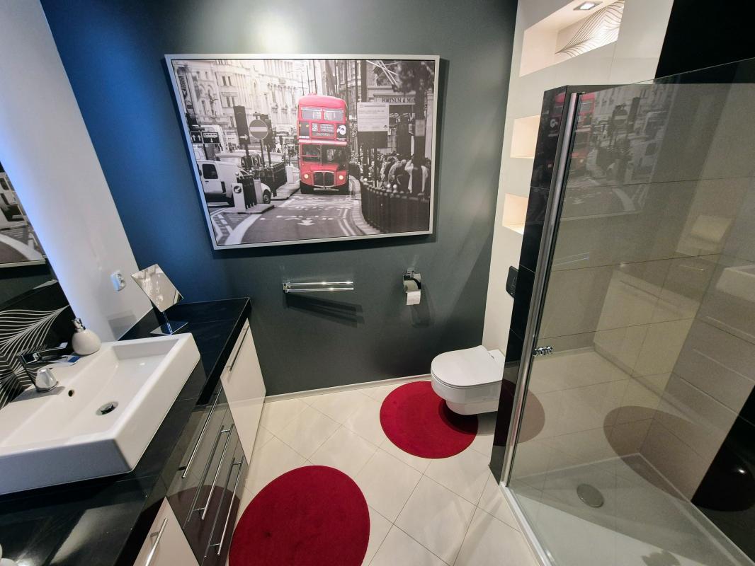Łazienka z nową, obszerną kabiną prysznicową.