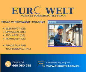 Agencja Pracy EURO WELT (KRAZ 12809) to certyfikowane biuro, które od 2015 roku pomaga kandydatom znaleźć satysfakcjonujące zatrudnienie w krajach niemieckojęzycznych. Zapewniamy Państwu przygotowanie do wyjazdu poprzez skompletowanie i tłumaczenie dokumentów aplikacyjnych a także zapewniamy opiekę przez cały okres zatrudnienia.