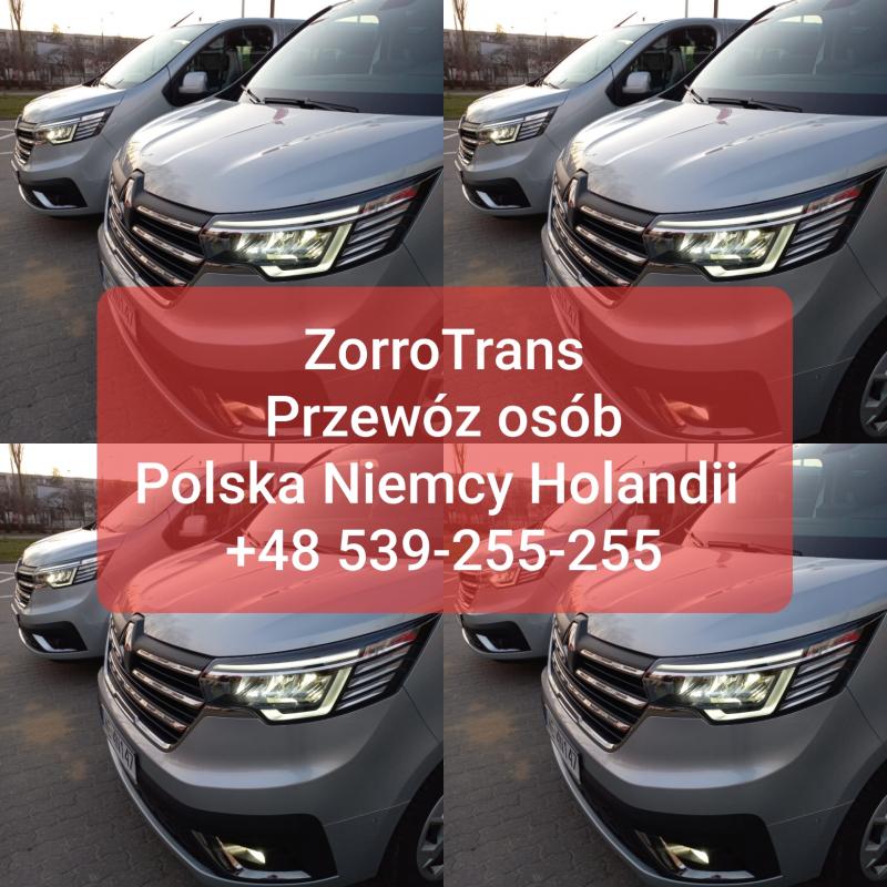 Firma ZorroTrans wykonuje licencjonowany przewóz Osób i paczek między Polską Niemcami i Holandią, jak i odwrotnie,obsługiwane województwa na terenie kraju to LUBUSKIE - ZACHODNIOPOMORSKIE , WIELKOPOLSKIE - KUJAWSKO POMORSKIE ,dysponujemy nowymi wygodnymi busami marki Renault Trafic,które są wyposażone w zestawy DVD, jezdzimy z adresu pod adres szybko i bezpiecznie CO PIATY PRZEJAZD 50% TANIEJ, zapraszamy serdecznie.