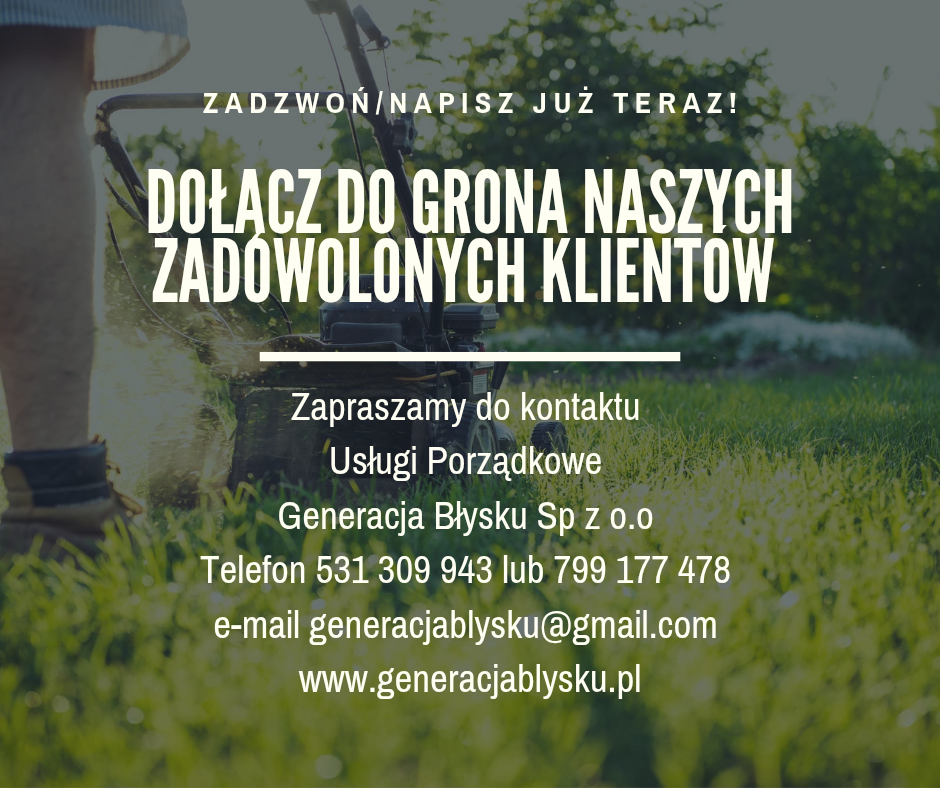 Jeśli poszukujesz rzetelnej firmy sprzątającej, która kompleksowo zajmie się czystością twojej nieruchomości w środku i na zewnątrz - zadzwoń 799 177 478/ 531 309 943 lub napisz [email protected]. Każda firma/wspólnota/spółdzielnia jest przez nas traktowana indywidualnie. Nasze usługi dopasowujemy pod wymagania klienta. Skontaktuj się z nami a na pewno się dogadamy :) Więcej o nas na stronie www.generacjablysku.pl