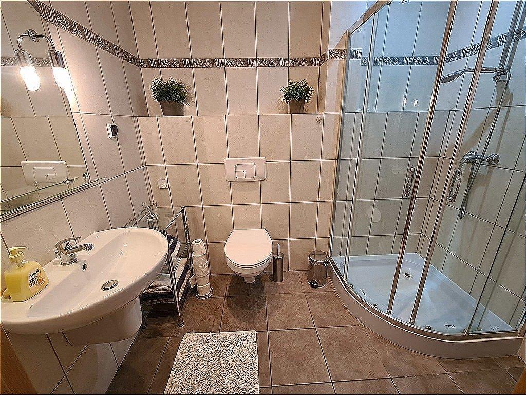 Łazienka z ogrzewaniem podłogowym (elektryczne - niezależne od sezonu grzewczego) i nową kabiną prysznicową.